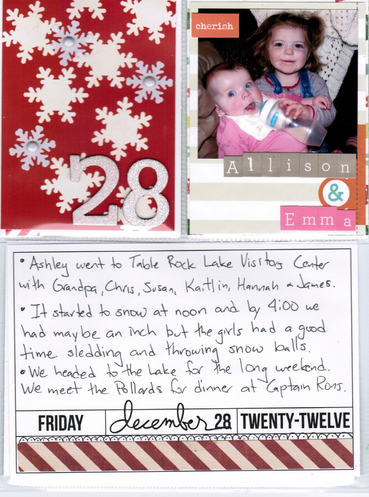 WooHoo this is the last of December Daily 2012 posts. Lots happened after Christmas, more parties, time at the lake with friends and snow! I have one page to go back and finish (day nine) and the very last page and I will be done! Now I need to do a big 2012 photo printing and start my 2012 albums!