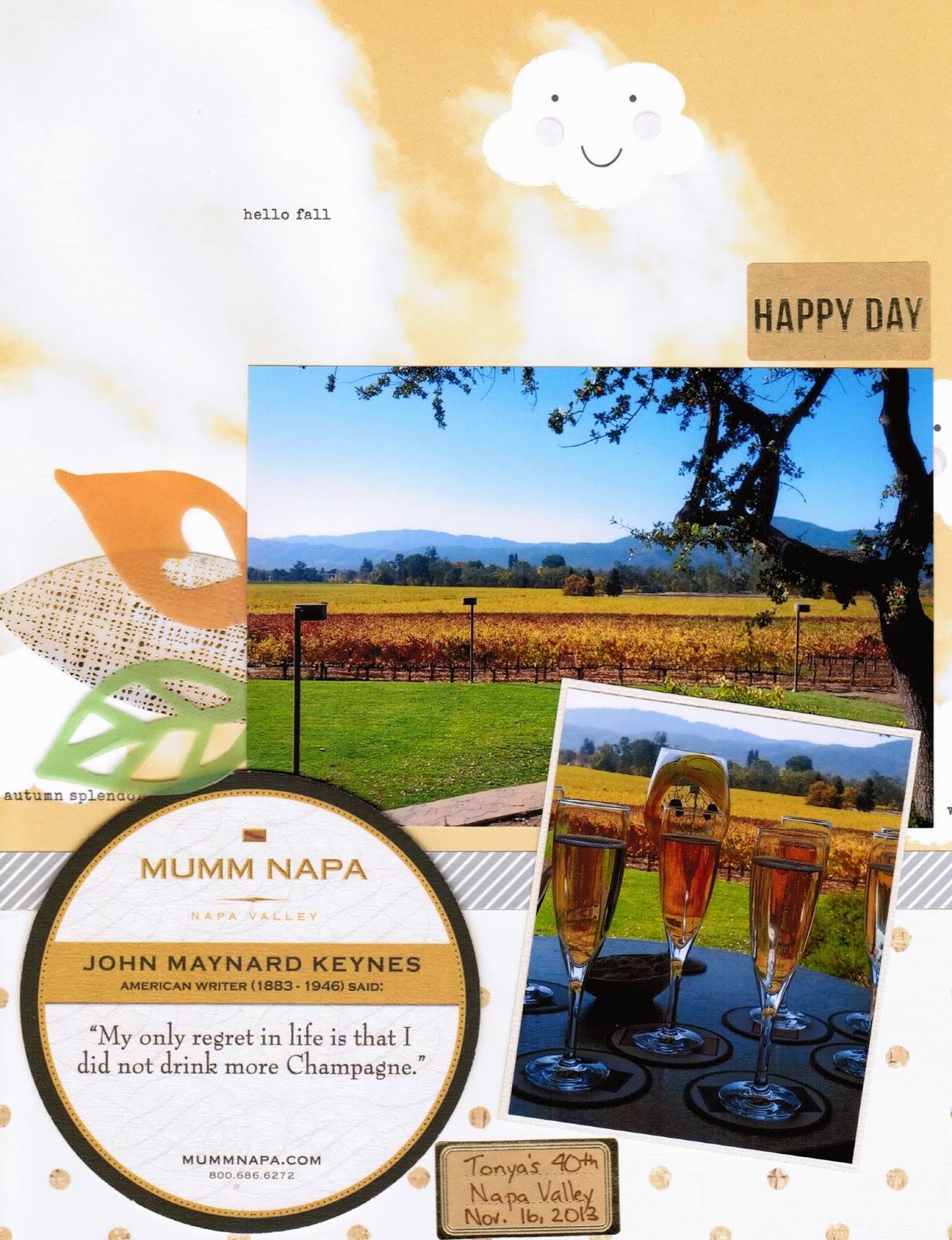Another quick layout using my Studio Calico November kit Walden. On Friday of our Napa trip the Taris' treated us to a ride on the wine train. We started off in the dinning car and had a gourmet lunch. I had tuna and I remember it was very good. All the while we were heading north up through the Napa Valley. We finished our trip in a lounge car with dessert. Our stop was Castello di Amorosa, a winery built to look like a castle. We had a tour scheduled and ended up with a great guide and the best part was the wine tasting at the very end! What an awesome day to remember forever. Thanks TnT!